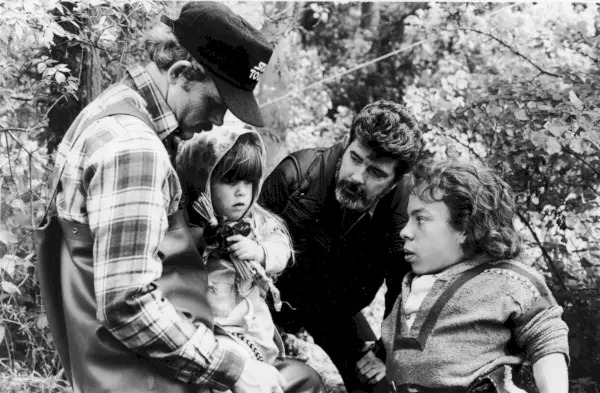 Instruktør Ron Howard, skuespiller Dawn Downing, producer George Lucas og skuespiller Warwick Davis diskuterer en scene på settet til fantasy-spillefilmen 'Willow' fra 1988.Lucasfilm/MGM/Med tilladelse fra Getty Images